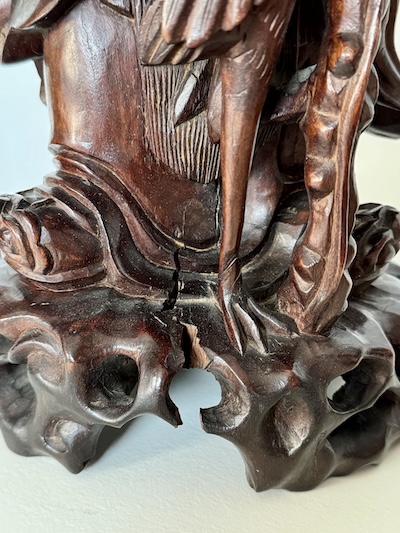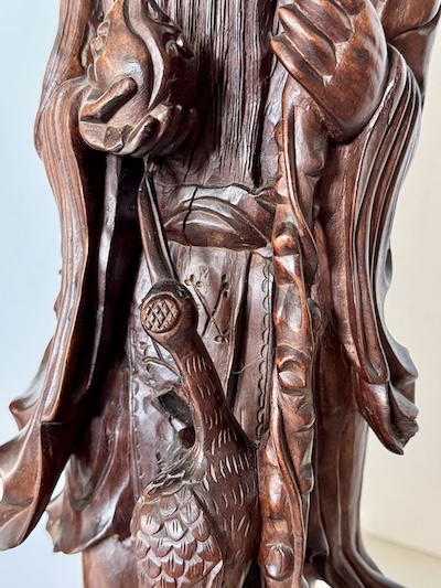Le travail du bois révèle un grand savoir-faire : les drapés du vêtement sont finement ciselés, le visage est expressif et empreint de sagesse, et la grue symbolique est délicatement représentée à ses pieds.