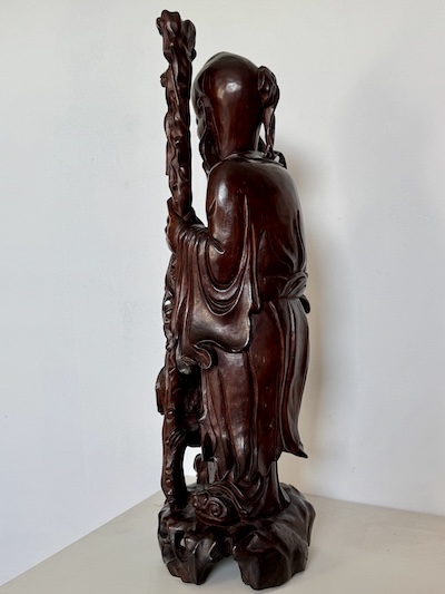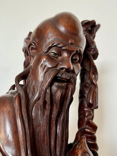 Cette sculpture chinoise traditionnelle incarne toute la sérénité et la bienveillance de Shou Xing, divinité vénérée pour apporter santé et longévité à ceux qui l’honorent.